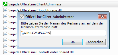 Mit dem Tool Sagede.OfficeLine.ClientAdmin.exe aus dem Verzeichnis C:\Program Files (x86)\Sage\Sage 100\<Versionsnummer>\Shared „Shared-Order“ erkennen Sie, ob der Client über die Server IP-Adresse oder den Servernamen, auf dem der Sage Mehrbenutzerdienst läuft, installiert wurde. Wenn nötig kann dieser Eintrag dann geändert werden.