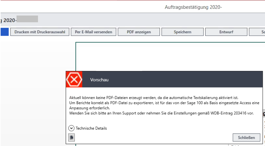 Beim Belegdruck bzw. Export von Berichten als PDF kommt eine Meldung, dass der Export nicht erfolgen kann und es wird auf den Sage-Wissensdatenbankeintrag 203416 hingewiesen.